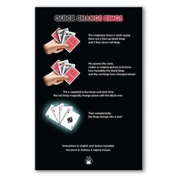 Ecco un packet trick super divertente e super facileda fare. Il mago mostra quattro re: due re neri a faccia in su e due re rossi a faccia in giù. Misteriosamente i re neri cambiano posto con i re rossi. Questo viene ripetuto un paio di volte, poi inaspettatamente i re si trasformano in quattro assi!