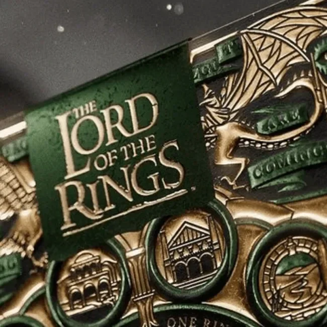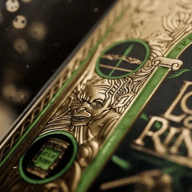 Realizzata con l'oro che Sauron ha usato per forgiare l'Unico Anello, insieme a una lamina verde smeraldo che riflette il lussureggiante paesaggio della Contea, la scatola è davvero unica nel suo genere. Le carte stesse sono prodotte negli Stati Uniti - stampate su carta certificata FSC derivata da foreste sostenibili, utilizzando inchiostri a base vegetale e laminati a base di amido.