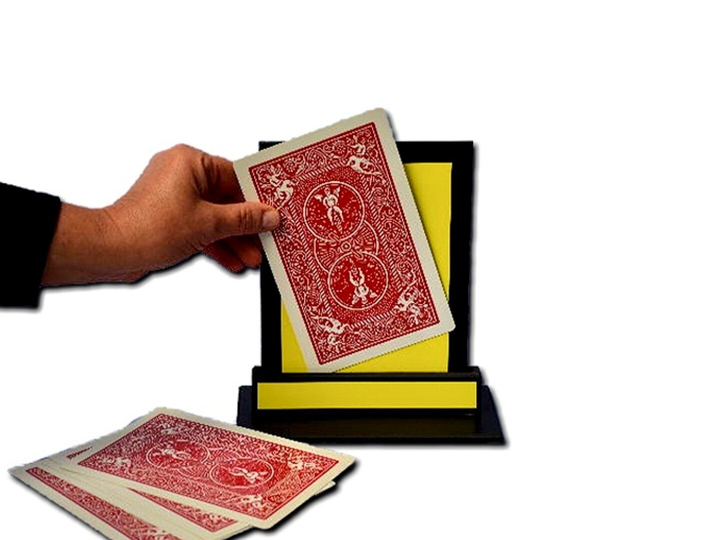 Nessuno, né il pubblico né il mago, può sapere di che carta si tratta. La procedura viene ripetuta con altri due membri del pubblico, in modo che tre carte siano appoggiate al supporto.