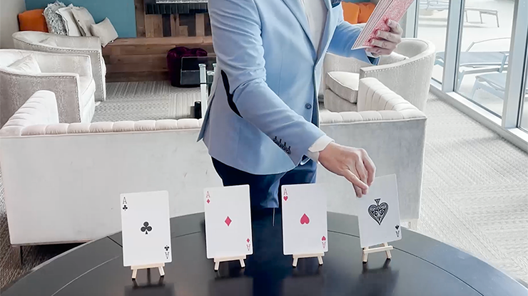 Un sorprendente assemblaggio di assi che incorporerai per sempre nel tuo repertorio. Mostri quattro assi e dodici carte indifferenti che vengono posizionate sul tavolo. Tre carte vengono distribuite su ciascun asso, creando un mazzetto con ogni asso. Gli assi scompaiono completamente uno per uno dai tre mazzetti per riunirsi insieme nel quarto.
