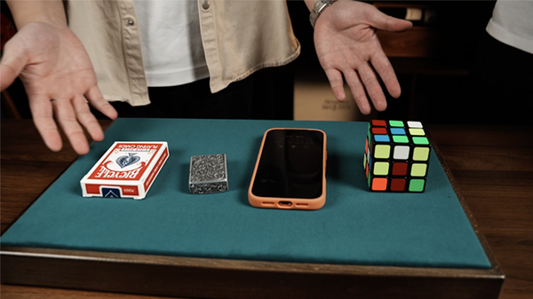 Il mago prende in prestito quattro oggetti di uso quotidiano a caso dal pubblico: un portafoglio, un telefono, un airpod o qualsiasi piccolo oggetto che lo spettatore stia portando con sé. Tutti gli oggetti vengono posizionati sul tappetino per il close-up.