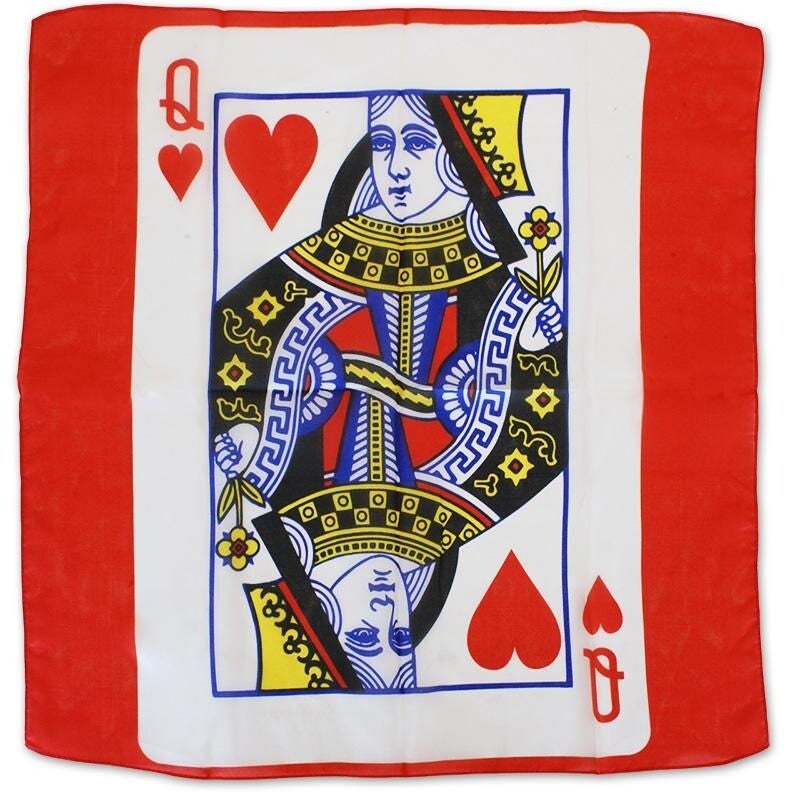 La più classica: si fa scegliere una carta da un mazzo, si mostra un foulard con una carta bianca stampata sopra. Quindi, si inserisce il foulard in una sacchetto scambi a strappo e aprendolo... la carta bianca si sarà magicamente stampata nella regina di cuori!